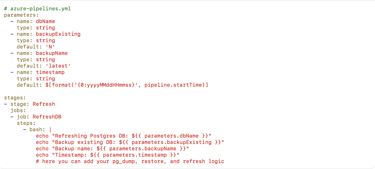Here’s the base pipeline that handles PostgreSQL refresh. It accepts four parameters, three of which have defaults:
